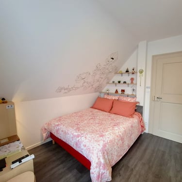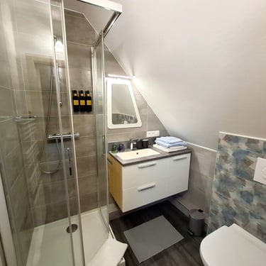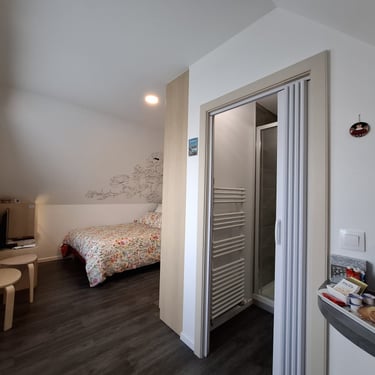 La chambre est située au deuxième étage de la maison. Elle est de style contemporain et contient une salle d'eau.