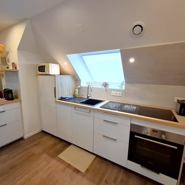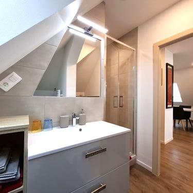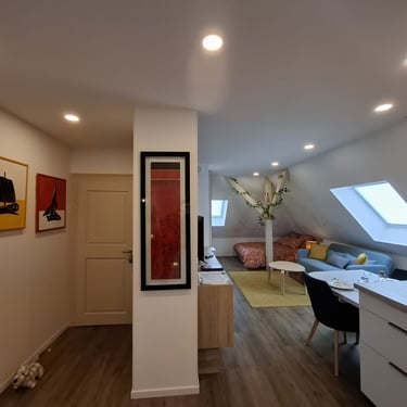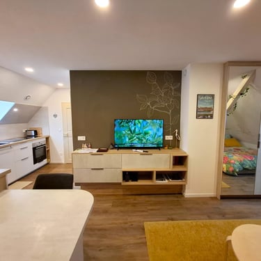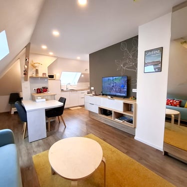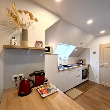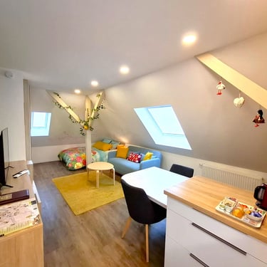Le studio Joséphine, situé au deuxième étage de la maison, séduit par son style contemporain et son atmosphère chaleureuse sous les combles. Il dispose d’une cuisine entièrement équipée, d’un coin séjour confortable ainsi que de nombreux espaces de rangement, pensés pour un séjour pratique et agréable. La salle d’eau indépendante est équipée d’une douche moderne, offrant confort et intimité.